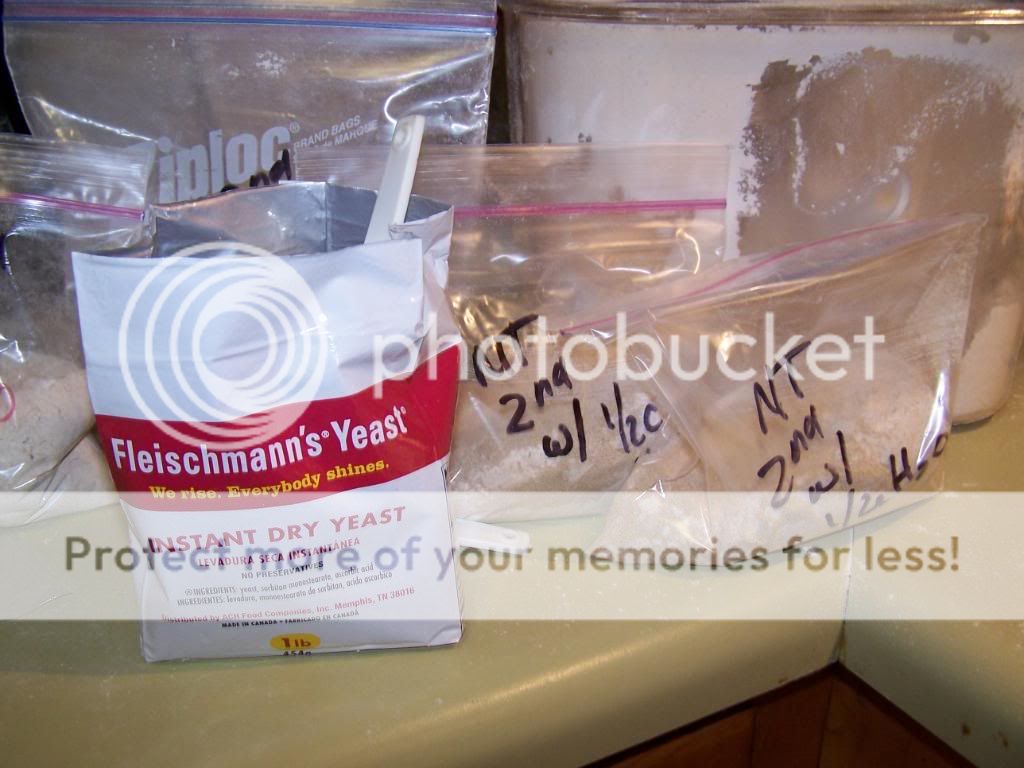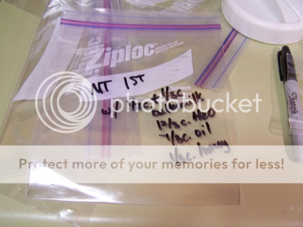 4. Into the “2nd” bags, also quart-sized, measure 1 cup of flour and 1 ½ Tbsp yeast. Write instructions on the outside of this bag to remind you to add ½ cup of warm water (110º-115º F) along with the contents.